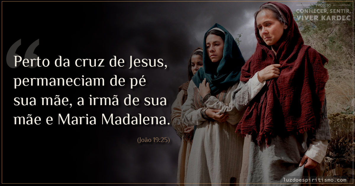 “Perto da cruz de Jesus, permaneciam de pé sua mãe, a irmã de sua mãe, Maria, mulher de Clopas, e Maria Madalena. Jesus, então, vendo a mãe e, perto dela, o discípulo a quem amava, disse à mãe: “Mulher, eis teu filho!” Depois disse ao discípulo: “Eis tua mãe!” E a partir dessa hora, o discípulo a recebeu em casa.”