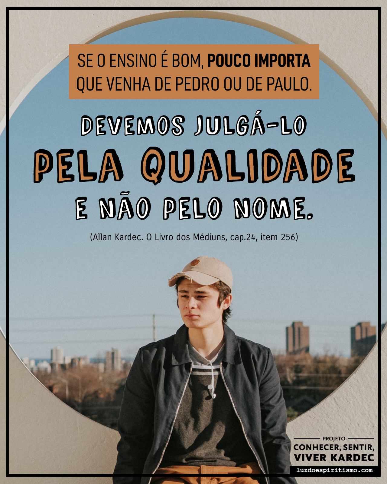 “(…) a questão da identidade, como dissemos, é mais ou menos indiferente quando se trata de instruções gerais, desde que os Espíritos mais elevados podem substituir-se mutuamente sem que isso acarrete consequências. Os Espíritos superiores constituem, por assim dizer, uma coletividade, cujas individualidades nos são, com poucas exceções, completamente desconhecidas. O que nos interessa não são as pessoas, mas o ensino. Ora, se o ensino é bom, pouco importa que venha de Pedro ou de Paulo. Devemos julgá-lo pela qualidade e não pelo nome. Se um vinho é mau, não é a etiqueta que o faz melhor.”