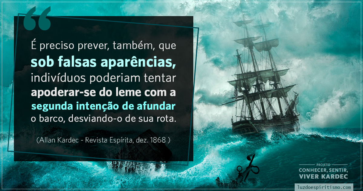 “Não faltarão intrigantes, pseudoespíritas que se queiram elevar pelo orgulho, pela ambição ou pela cupidez; outros que alardearão pretensas revelações, com a ajuda das quais procurarão pôr-se em relevo e fascinar as imaginações muito crédulas. É preciso prever, também, que sob falsas aparências, indivíduos poderiam tentar apoderar-se do leme com a segunda intenção de afundar o barco, desviando-o de sua rota. Ele não naufragará, mas poderia experimentar desagradáveis atrasos que é preciso evitar. Eis aí, sem contestação, os maiores escolhos de que o Espiritismo se deve guardar; quanto mais consistência ele toma, mais embustes lhe criarão os seus adversários.”