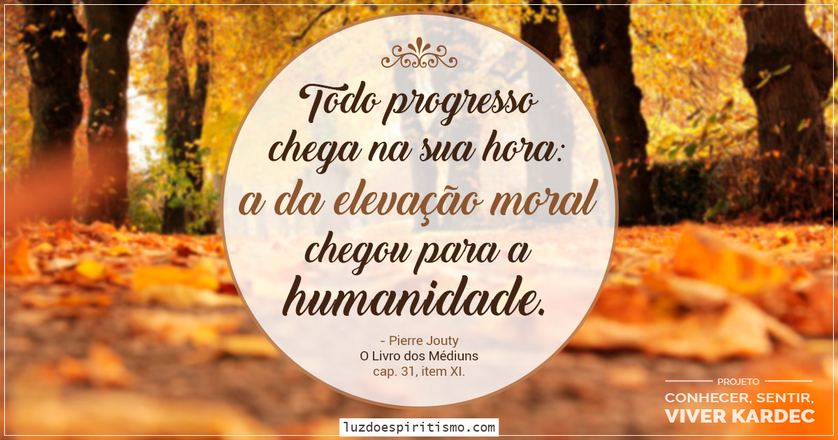 “Hoje, que os progressos da Indústria e das Ciências desenvolveram a arte de bem viver, de tal maneira que as tendências materiais se tornaram dominantes, Deus quer que os espíritos sejam reconduzidos aos interesses da alma. Ele quer que o aperfeiçoamento do homem moral se transforme naquilo que deve ser, isto é, na finalidade e no alvo da vida. O Espírito humano segue suas marchas necessárias, semelhantes à graduação por que passam todas as coisas no Universo visível e invisível. Todo progresso chega na sua hora: a da elevação moral chegou para a humanidade. Ela não se cumprirá ainda nos vossos dias, mas agradecei ao Senhor por assistirdes a essa alvorada bendita.”